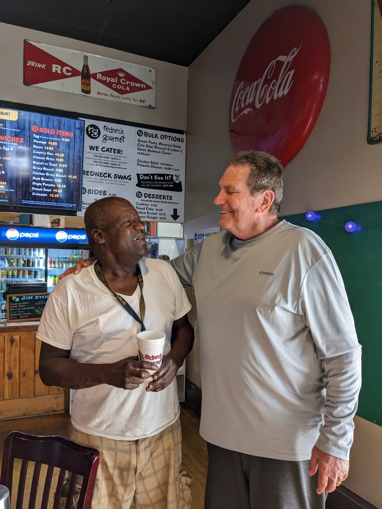 While at the Redneck Gourmet for breakfast with the ROMEOS (Retired Old Men Eating Out) I met Curtiss. He has a speech impediment so he’s very hard to understand. He also walks with a distinct limp, sort of dragging one of his feet as he walks. Yes, he is a professional panhandler, and quite good at it, but he’s been disadvantaged probably his whole life. I try to give him a ride where he needs to go when our breakfast is done.